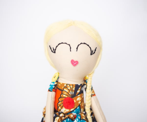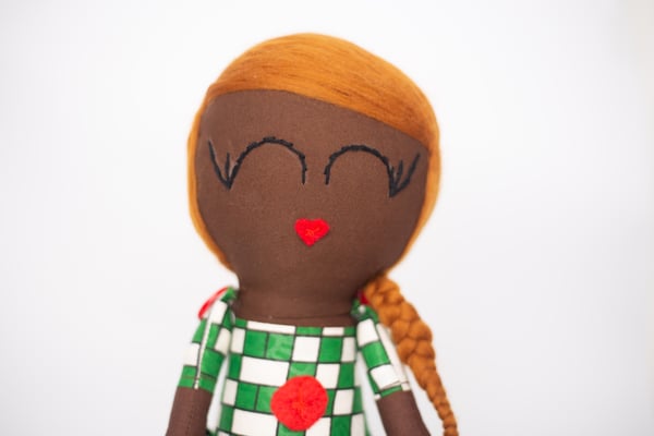 Fela and Friends dolls are made from cotton and stuffed with polyester fibre filling. The dolls skirt is made with Ankara fabric.